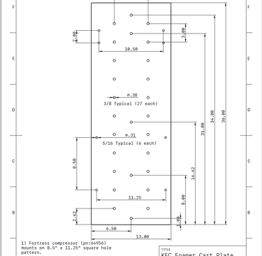 By mounting your Bryan Exhaust Tools Foamer, hose reel, and compressor onto a commonly available hand truck, you turn a 20-minute setup into a 2-minute "plug and play" experience. All you need is the KEC Foamer Pack-Out “Plate”, Bryan Foamer, compressor, hand truck and reel. If you want to make your own plate. Just get a 36”x13” plate of steel, aluminum, or carbon fiber and use these drawings to build your own plate.